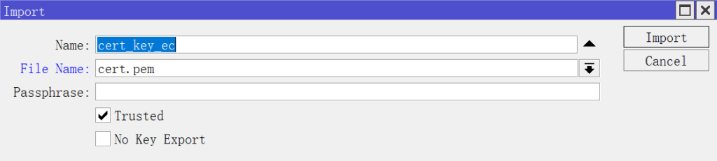 先导入证书文件,并取合适的名字,然后再导入密钥文件。