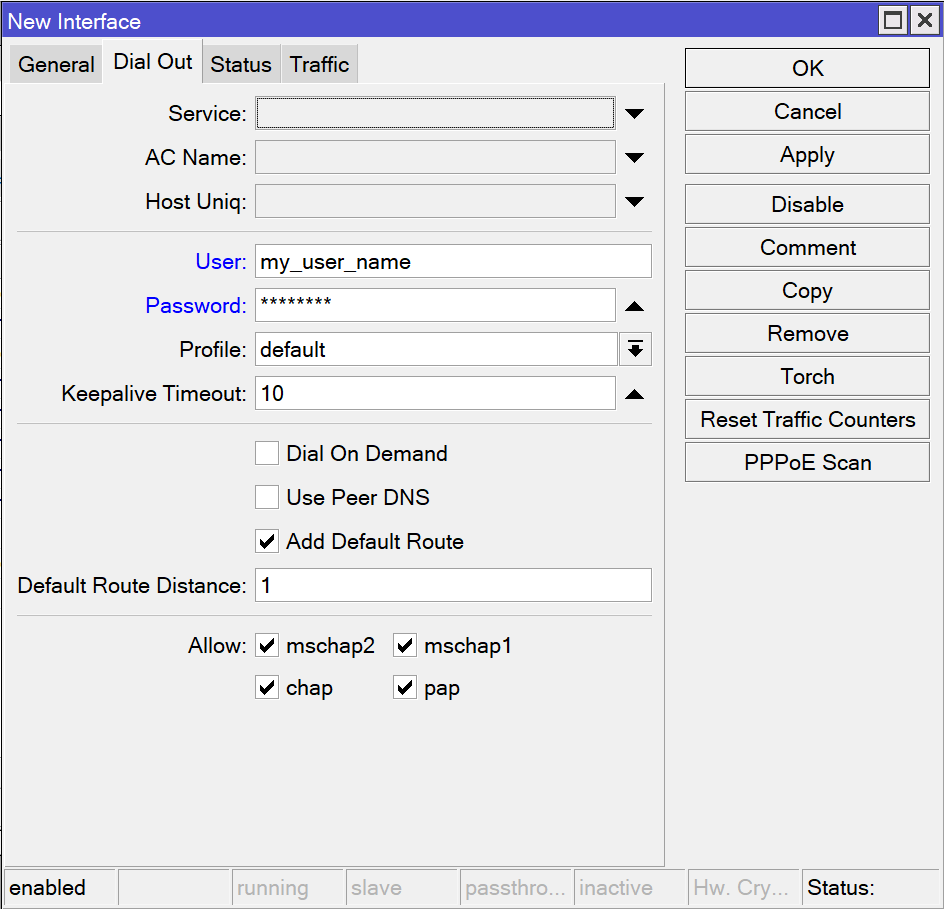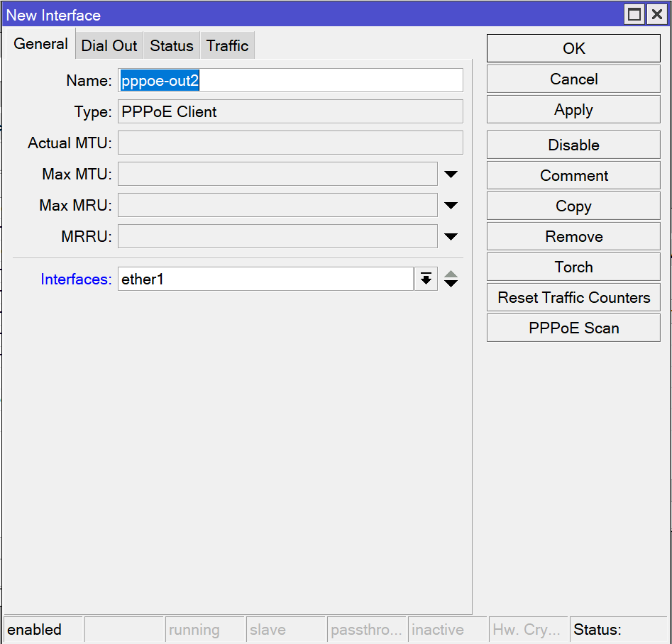 打开Interfaces页面,在Interface标签点击”+”号右边的下箭头,在弹出菜单中选择 PPPoE Client。在弹出窗口中General标签页设置自定义的名称,Interfaces处选择ether1做为拨号端口。然后在Dial Out标签页设置拨号上网的用户名和密码。点击OK完成。如果正常拨号成功,可在 IP => Addresses 页面看到获得的外网IP。