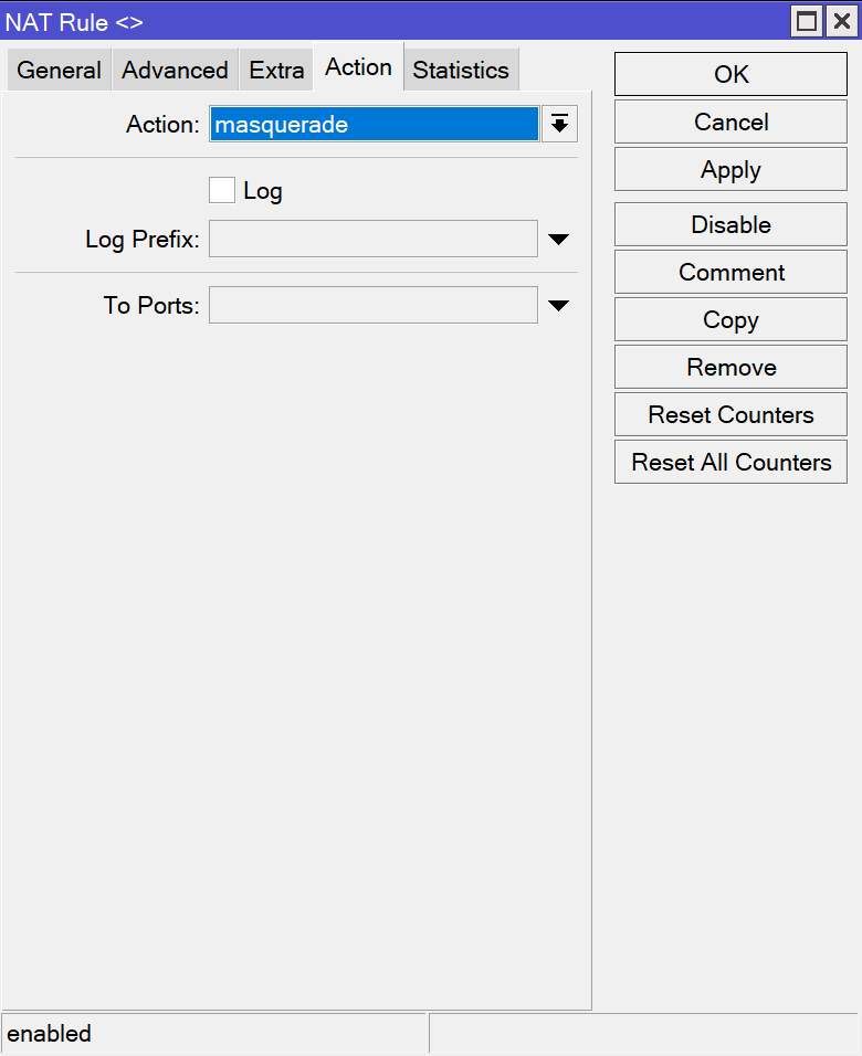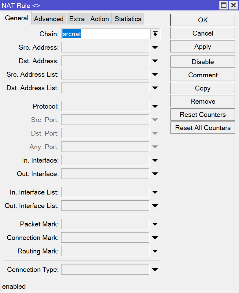 NAT转发设置位于 IP => Firewall 页面,在NAT标签页下面点击”+”号增加一条转发规则。在弹出窗口中的General页面设置Chain为srcnat,然后去到Action页面设置Action为masquerade。这条NAT规则为所有访问互联网的数据使用路由器外部端口的IP进行伪装,这样返回的数据能够正确地回传到路由器。