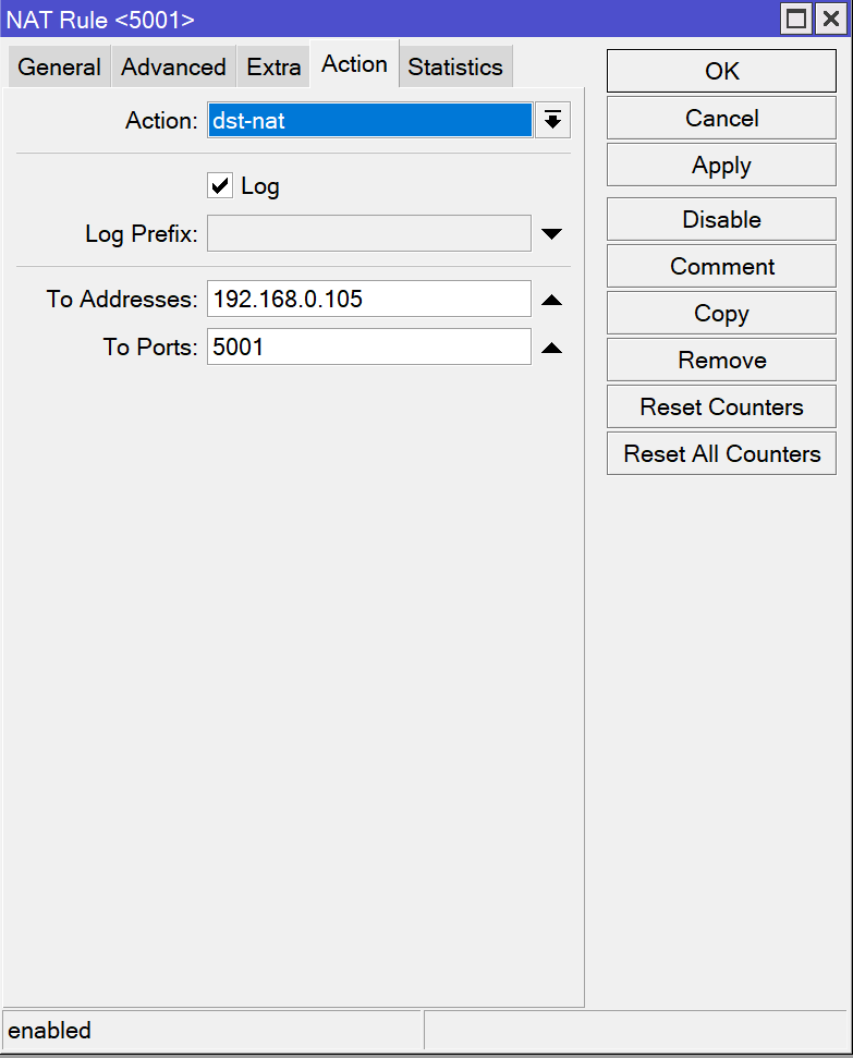 当需要从外部访问局域网内部的服务时(例如从外网访问内部的NAS),需要对相应的端口在路由器上进行映射。RouterOS的端口映射也是通过相应的NAT设置实现的。例如需要将内部服务器的5001端口映射到外网可以进行如下的设置。