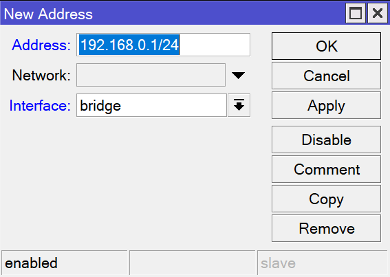 3.1 设置内网IP地址。进入 IP => Addresses 页面,添加一个条目。在Address位置填写Bridge的IP地址及掩码位数(/24表示子网掩码为255.255.255.0),在Interface位置选择之前创建的Bridge名称。
