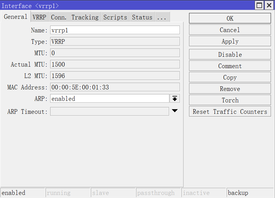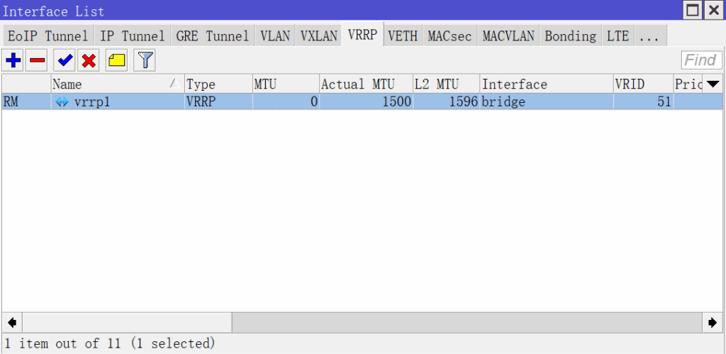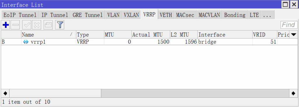 设置好虚拟路由器之后可在RouterOS上查看虚拟网关的状态,当OpenWRT主网关在线时,VRRP设备的状态为B,表示备用(Backup)。