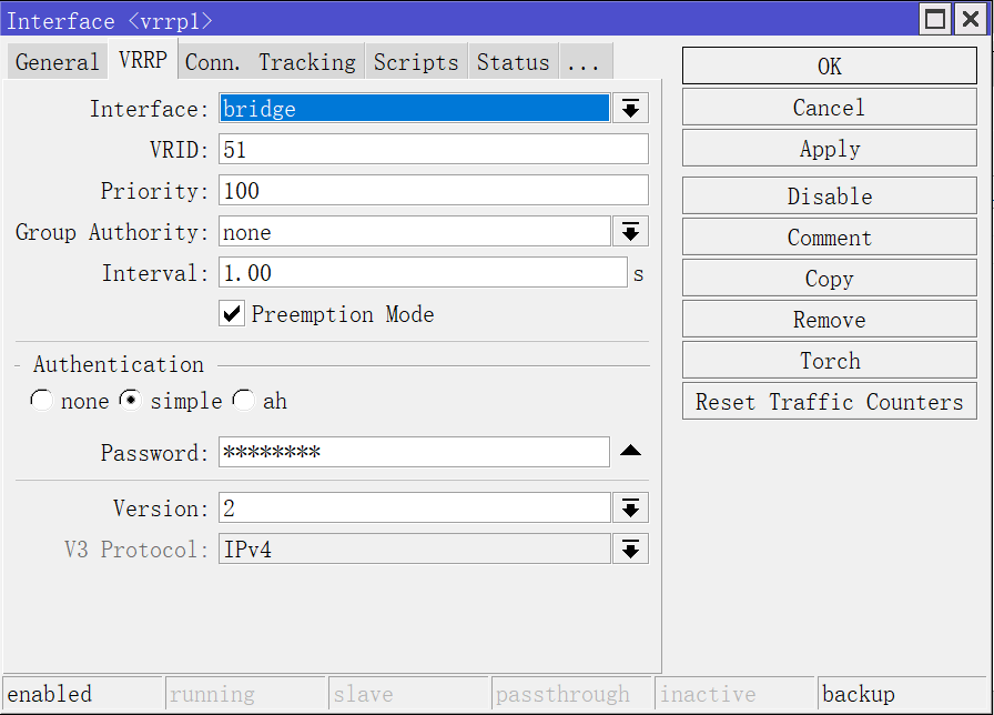 首先在RouterOS创建一个VRRP设备。打开Interfaces页面,在VRRP页面点击”+”创建VRRP设备。在弹出窗口的General页面填写一个自定义的设备名称;在VRRP页面中Interface选择内网网桥设备,选择一个VRID,此例中为51;缺省的优先级为100,优先级数字越大优先级越高;Authentication位置选择simple,设置一个不超过8个字母的paassword,版本选择2,Protocol选择IPv4。