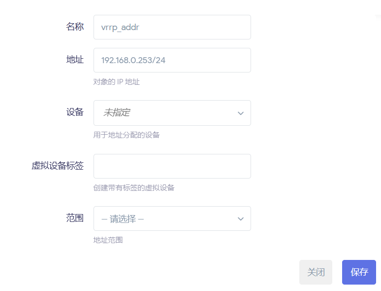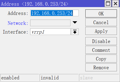 点击OK创建VRRP设备后会提示设备缺少一个IP地址。打开 IP => Addresses 页面点击”+”为VRRP设备设置一个IP地址。此例中设置为192.168.0.253/24(/24表示24位子网掩码),Interface选择刚刚创建的VRRP设备名称。此IP地址将做为虚拟网关的IP地址。