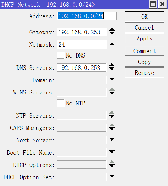 为了让所有的内网设备使用虚拟网关做为其缺省网关,还需要在DHCP服务器设置中将派发的网关和DNS IP地址指定为虚拟网关的IP地址。打开 IP => DHCP Server 页面,在Network标签页编辑网关和DNS地址,修改为上面VRRP的IP地址。