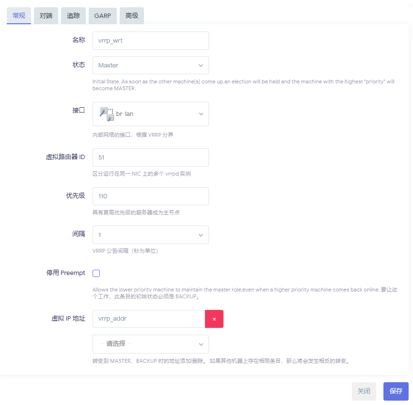 然后切换到”实例”标签页,选择”添加”创建一个VRRP实例。设置一个名称,状态为Master,接口选择网桥设备,虚拟路由器ID选择与RouterOS设置相同,此例中为51。由于要让OpenWRT具有较高的优先级,因此优先级设置必须比RouterOS设置的优先级(100)大,此例中设置为110;虚拟IP地址选择刚刚添加的IP地址名称。
